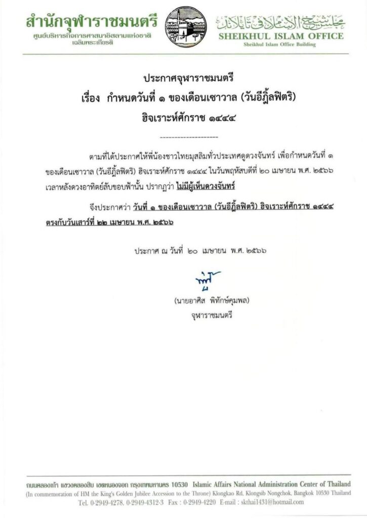 กรุงเทพฯ 20 เม.ย. – นายกฯ กล่าวในวันอีฎิ้ลฟิตริ ฮ.ศ.1444 ส่งความรัก ความระลึกถึง ความปรารถนาดียังพี่น้องชาวไทยมุสลิมทุกคน ชื่นชมจิตใจอันบริสุทธิ์ที่บริบูรณ์ไปด้วยศรัทธา ในการทำคุณงามความดีถวายแด่เอกองค์พระผู้อภิบาล