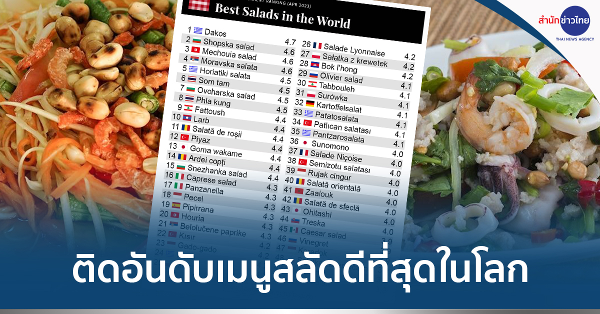 ทำเนียบ 22 เม.ย.-โฆษกรัฐบาลเผย นายกฯ ปลื้ม TasteAtlas จัดอันดับให้อาหารไทย เมนูส้มตำ และ พล่ากุ้ง ติดอันดับที่ 6 และ 9 ในอันดับเมนูสลัดที่ดีที่สุดในโลก 10 Best Rated SALADS in the World เสริมสร้างอัตลักษณ์อาหารไทย ในเวทีโลก