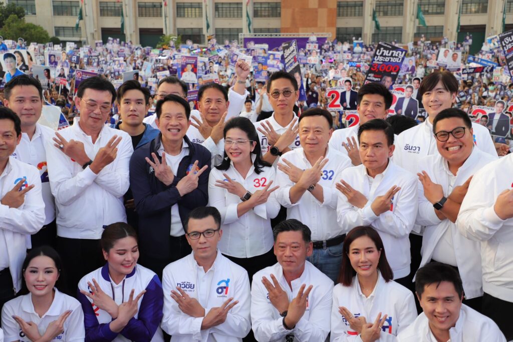 คุณหญิงสุดารัตน์ เกยุราพันธุ์ หัวหน้าพรรคไทยสร้างไทย และแคนดิเดตนายกรัฐมนตรี พรรคไทยสร้างไทย นายสุพันธุ์ มงคลสุธี รองหัวหน้าพรรค ไทยสร้างไทย และแคนดิเดตนายกรัฐมนตรี นายฐากร ตัณฑสิทธิ์ เลขาธิการพรรค น.อ.อุดิษฐ์ นาครทรรพ รองหัวหน้าพรรคไทยสร้างไทย นายต่อพงษ์ ไชยสาส์น รองหัวหน้าพรรคไทยสร้างไทย นายนพดล มังกรชัย รองหัวหน้าพรรคไทยสร้างไทย พร้อมผู้สมัคร ส.ส.กทม.พรรคไทยสร้างไทย ร่วมปราศรัยใหญ่พรรคไทยสร้างไทย