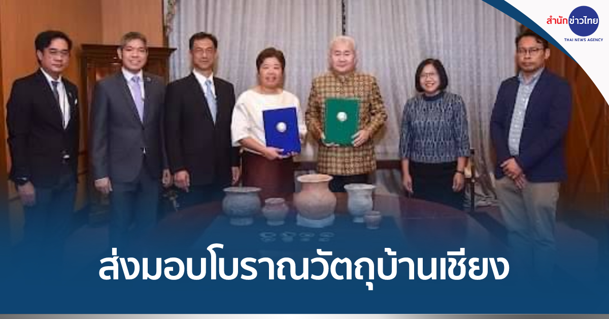 ผู้สื่อข่าวรายงานจากกระทรวงการต่างประเทศว่า วันนี้ (25 เม.ย.) เวลา 15.00 น. นายณัฐพล ขันธหิรัญ รองปลัดกระทรวงการต่างประเทศ ได้ส่งมอบโบราณวัตถุบ้านเชียง จำนวน 13 รายการ ซึ่งได้รับคืนจากชาวไทยที่พำนักในสหรัฐอเมริกา กลับสู่ประเทศไทย ให้นายพนมบุตร จันทรโชติ อธิบดีกรมศิลปากร โดยมีนางกาญจนา ภัทรโชค อธิบดีกรมสารนิเทศ และ น.ส.นิตยา กนกมงคล ผู้อำนวยการสำนักพิพิธภัณฑสถานแห่งชาติ กรมศิลปากร และข้าราชการ ร่วมเป็นสักขีพยาน