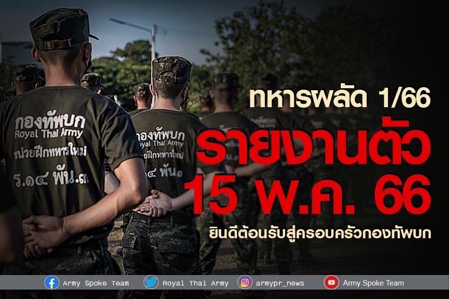 กรุงเทพ 30 เม.ย. – ทบ.แจ้งอีกครั้ง ทหารใหม่ผลัด 1/66 และทหารออนไลน์ รายงานตัวเข้าหน่วยทหาร 15 พ.ค.นี้ เปิดทางให้ใช้สิทธิเลือกตั้งก่อนเข้าประจำการ
