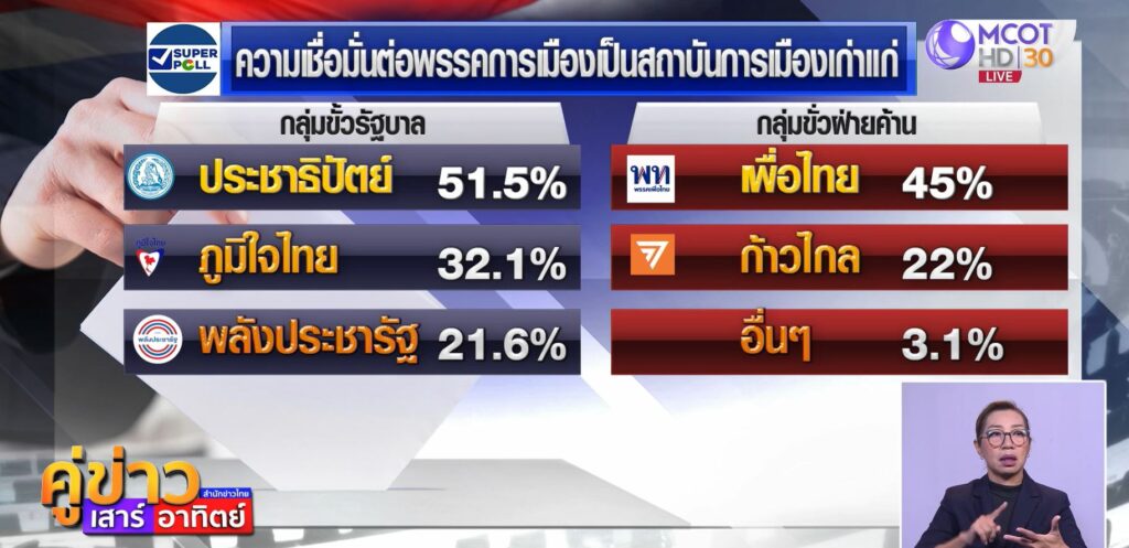 เมื่อสอบถามประเด็นความเชื่อมั่นต่อพรรคการเมืองเป็นสถาบันการเมืองเก่าแก่ พบว่าในกลุ่มขั้วรัฐบาลร้อยละ 51.1 ระบุเป็นพรรคประชาธิปัตย์ ร้อยละ 32.1 ระบุเป็นพรรคภูมิใจไทย และร้อยละ 21.6 ระบุพรรคพลังประชารัฐ ในขณะที่กลุ่มขั้วฝ่ายค้าน ร้อยละ 45.0 ระบุเป็นพรรคเพื่อไทย ร้อยละ 22.0 ระบุเป็นพรรคก้าวไกล