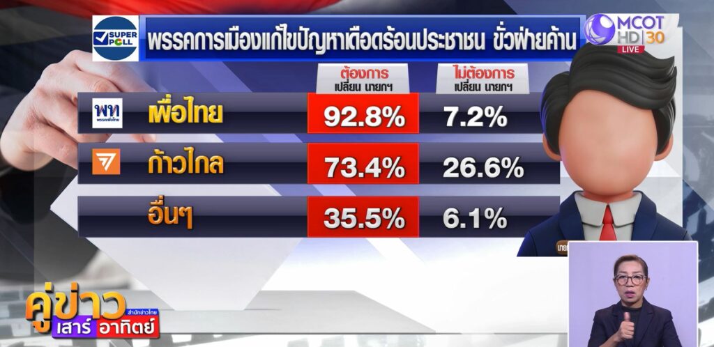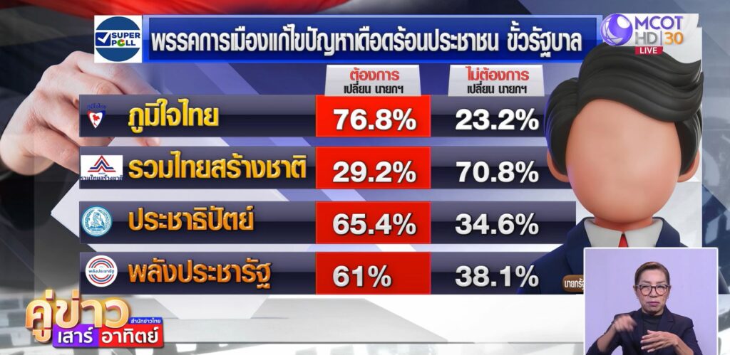 กทม. 30 เม.ย.-ซูเปอร์โพล เผยผลสำรวจเรื่องสุดขั้วการเมือง ระบุพลังเงียบไม่หนุนรัฐบาล ประชาชนต้องการเปลี่ยนนายกฯ ส่วนพรรคหลักขั้วรัฐบาลที่ต้องการเปลี่ยนตัวนายกฯ คือ พรรคภูมิใจไทย, พรรคประชาธิปัตย์, พรรคพลังประชารัฐ,