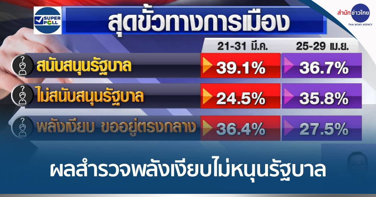 ผลสำรวจพบแนวโน้มของกลุ่มพลังเงียบขออยู่ตรงกลาง เริ่มกระจายตัวออกไปยังขั้วการเมืองต่าง ๆ อย่างมีนัยสำคัญทางสถิติคือ จากร้อยละ 36.4 ในช่วงปลายเดือนมีนาคม ลดลงเหลือร้อยละ 27.5 ในช่วงปลายเดือนเมษายน พบว่าได้กระจายตัวฐานสนับสนุนไปยังขั้วการเมืองที่ไม่สนับสนุนรัฐบาลมากกว่า คือ จากร้อยละ 24.5 ช่วงปลายเดือนมีนาคม เพิ่มขึ้นเป็นร้อยละ 35.8 ที่ไม่สนับสนุนรัฐบาลในช่วงปลายเดือนเมษายน โดยฐานสนับสนุนรัฐบาลลดลงจากร้อยละ 39.1 ช่วงปลายเดือนมีนาคม ลงมาอยู่ที่ร้อยละ 36.7 ในการสำรวจล่าสุด