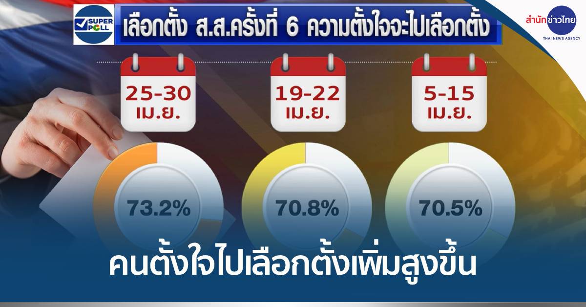 ซูเปอร์โพลได้เผยโพลเลือกตั้ง ส.ส. ครั้งที่ 6 สำรวจวันที่ 25 – 30 เมษายน โดยเมื่อถามถึงความตั้งใจจะไปเลือกตั้งผู้แทนราษฎร ครั้งนี้ พบแนวโน้มคนตั้งใจจะไปเลือกตั้งเพิ่มสูงขึ้นจาก ร้อยละ 70.8 ในช่วงสัปดาห์ก่อน ขึ้นเป็นร้อยละ 73.2 ในการสำรวจล่าสุดสัปดาห์นี้