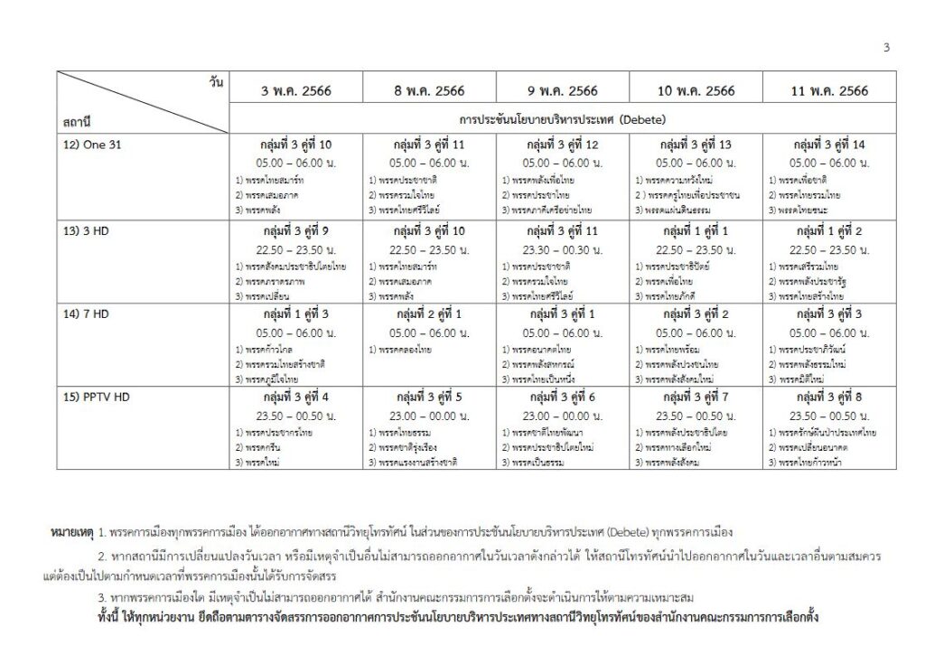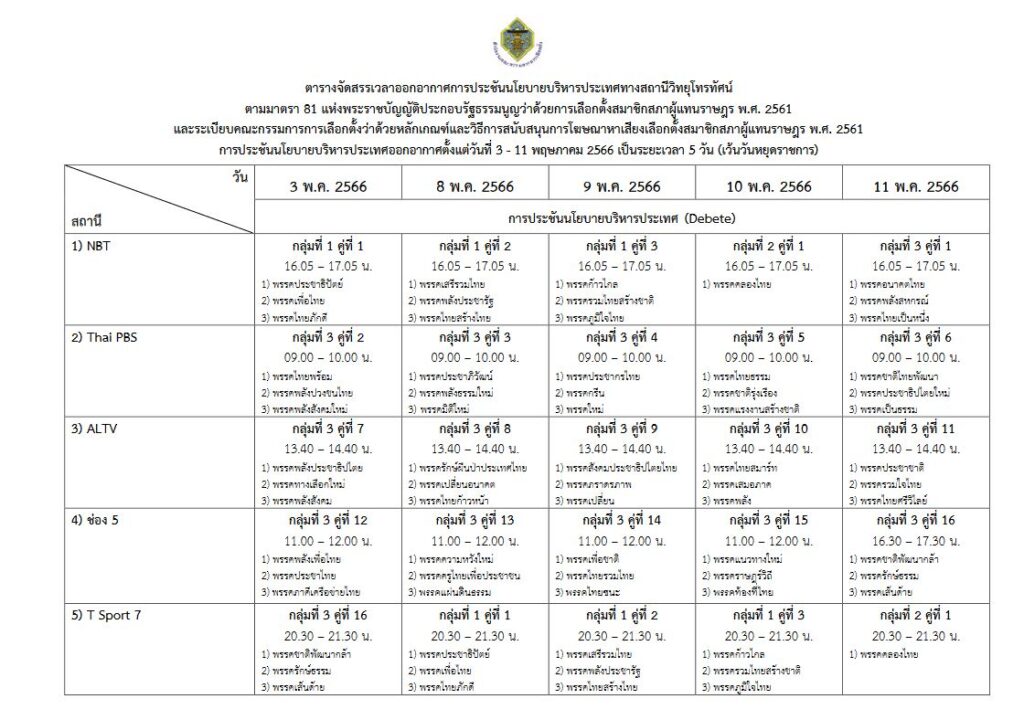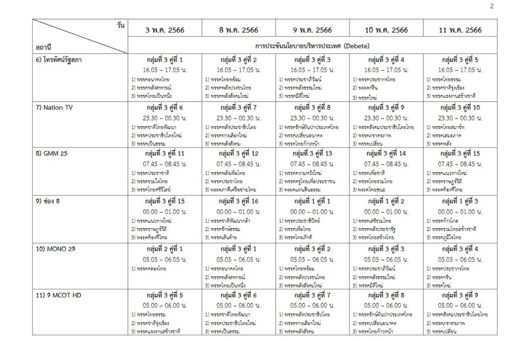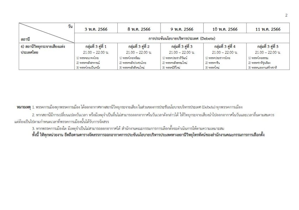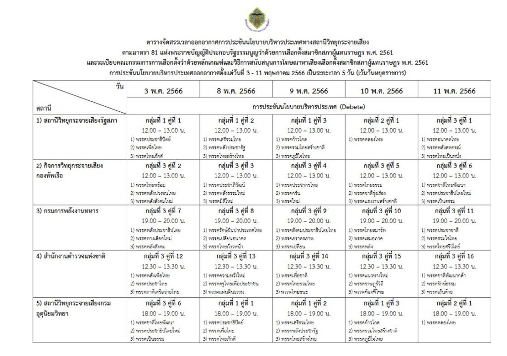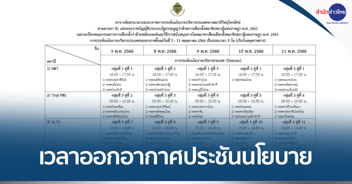 - เวลาออกอากาศการประชันนโยบายบริหารประเทศ (Debate) ทางสถานีวิทยุกระจายเสียง จำนวน 6 สถานี ออกอากาศในวันที่ 3 – 11 พฤษภาคม 2566 เป็นระยะเวลา 5 วัน (เว้นวันหยุดราชการ) ทุกพรรคการเมือง และ 2. เวลาออกอากาศการประชันนโยบายบริหารประเทศ (Debate) ทางสถานีวิทยุโทรทัศน์ จำนวน 15 สถานี ออกอากาศในวันที่ 3–11 พฤษภาคม 2566 เป็นระยะเวลา 5 วัน (เว้นวันหยุดราชการ) ทุกพรรคการเมือง