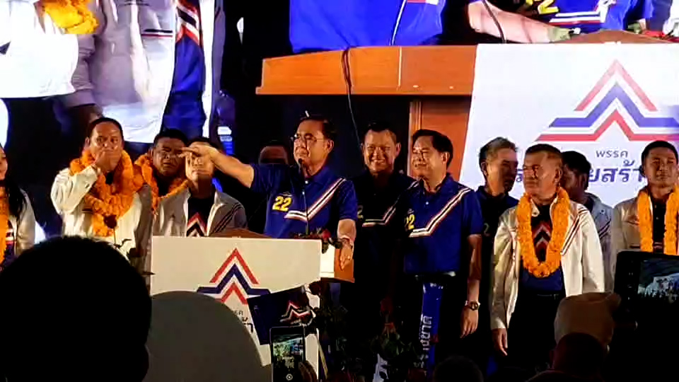 ที่ลานปราศรัยข้างโรงแรมวังใต้ จังหวัดสุราษฎร์ธานี พรรครวมไทยสร้างชาติ (รทสช.) นำโดย พล.อ.ประยุทธ์ จันทร์โอชา ประธานคณะกรรมการกำหนดแนวทางและยุทธศาสตร์ พรรครวมไทยสร้างชาติ พร้อมด้วย นายพีระพันธุ์ สาลีรัฐวิภาค หัวหน้าพรรค นายเอกนัฏ พร้อมพันธุ์ เลขาธิการพรรค ดร.ธนกร วังบุญคงชนะ รองหัวหน้าพรรค นายอนุชา บูรพชัยผศรี รองหัวหน้าพรรค นายชุมพล กาญจนะ อดีตส.ส.สุราษฎร์ธานีหลายสมัย นายพงษ์ศักดิ์ จ่าแก้ว นายกอบจ.สุราษฎร์ธานี และคณะผู้บริหารพรรคขึ้นเวทีปราศรัยใหญ่ครั้งแรกในจังหวัดสุราษฎร์ธานี ท่ามกลางประชาชนมารอฟังปราศรัยกว่าหมื่นคน