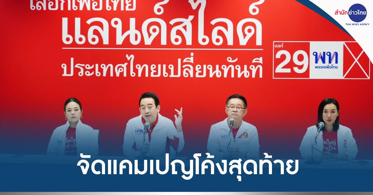 พรรคเพื่อไทยนำโดยนายประเสริฐ จันทรรวงทอง เลขาธิการพรรคเพื่อไทย และผู้สมัคร ส.ส.แบบบัญชีรายชื่อ พรรคเพื่อไทย นายเผ่าภูมิ โรจนสกุล รองเลขาธิการพรรคเพื่อไทย และผู้สมัคร ส.ส.แบบบัญชีรายชื่อ พรรคเพื่อไทย นางสาวลิณธิภรณ์ วริณวัชรโรจน์ รองเลขาธิการพรรคเพื่อไทย รักษาการโฆษกพรรคเพื่อไทย และผู้สมัคร ส.ส.แบบบัญชีรายชื่อ พรรคเพื่อไทย นางสาวขัตติยา สวัสดิผล ผู้สมัคร ส.ส.แบบบัญชีรายชื่อ พรรคเพื่อไทย แถลงข่าวเปิดตัวแคมเปญโค้งสุดท้ายก่อนเลือกตั้งปี 2566 ‘เลือกเพื่อไทยแลนด์สไลด์ ประเทศไทยเปลี่ยนทันที’ ณ ที่ทำการพรรคเพื่อไทย