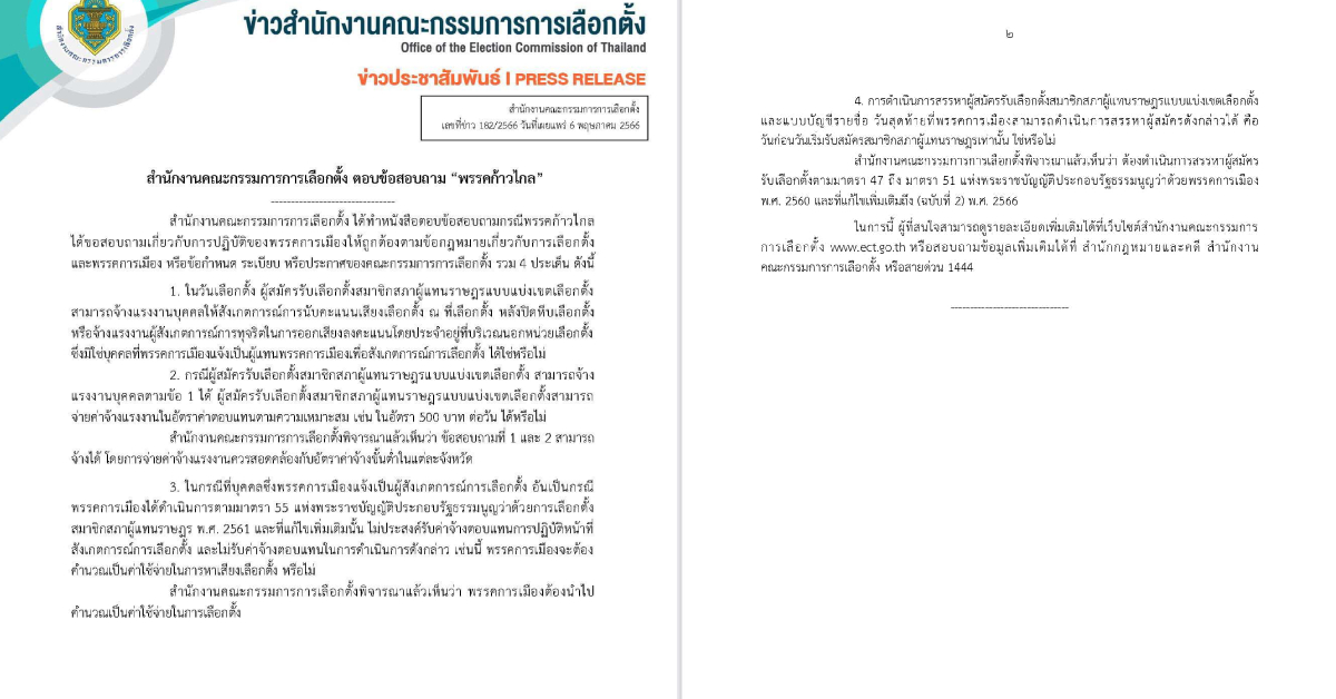 สำนักงาน กกต. เผยแพร่การตอบข้อสอบถามกรณีพรรคก้าวไกลสอบถามเกี่ยวกับการปฏิบัติของพรรคการเมืองให้ถูกต้องตามข้อกฎหมายเกี่ยวกับการเลือกตั้ง และพรรคการเมือง หรือข้อกำหนด ระเบียบ หรือประกาศของคณะกรรมการการเลือกตั้ง ว่าในวันเลือกตั้ง ผู้สมัครรับเลือกตั้ง ส.ส.แบบแบ่งเขตเลือกตั้ง จะสามารถจ้างแรงงานบุคคลให้สังเกตการณ์การนับคะแนนเสียงเลือกตั้ง ณ ที่เลือกตั้ง หลังปิดหีบเลือกตั้ง หรือจ้างแรงงานผู้สังเกตการณ์การทุจริตในการออกเสียงลงคะแนนโดยประจำอยู่ที่บริเวณนอกหน่วยเลือกตั้ง ซึ่งไม่ใช่บุคคลที่พรรคการเมืองแจ้งเป็นผู้แทนพรรคการเมืองเพื่อสังเกตการณ์การเลือกตั้งได้หรือไม่ และหากสามารถจ้างแรงงานได้ ผู้สมัครรับเลือกตั้ง ส.ส. สามารถจ่ายค่าจ้างแรงงานในอัตราค่าตอบแทนตามความเหมาะสม เช่น ในอัตรา 500 บาทต่อวัน ได้หรือไม่