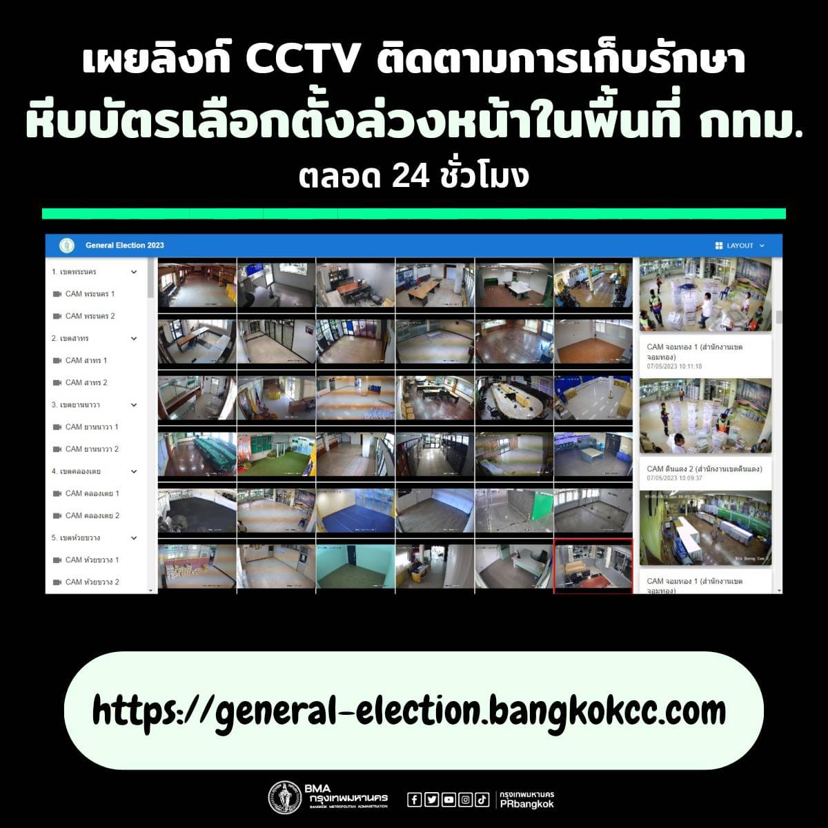 (7 พ.ค.66) นายชัชชาติ สิทธิพันธุ์ ผู้ว่าราชการกรุงเทพมหานคร เปิดเผยผ่านเฟซบุ๊กว่า กรุงเทพมหานครได้ติดตั้งกล้อง CCTV ตรวจดูหีบบัตรเลือกตั้งล่วงหน้าตลอด 24 ชั่วโมง เพื่อความโปร่งใสเป็นธรรม โดยสามารถดูได้ตามลิงก์นี้ https://general-election.bangkokcc.com/
