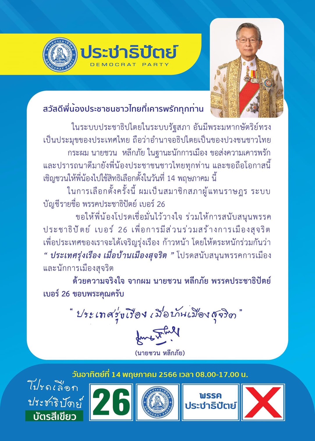 กระผม นายชวน หลีกภัย ในฐานะนักการเมือง ขอส่งความเคารพรัก และปรารถนาดีมายังพี่น้องประชาชนชาวไทยทุกท่าน และขอถือโอกาสนี้ เชิญชวนให้พี่น้องไปใช้สิทธิเลือกตั้งในวันที่ 14 พฤษภาคมนี้