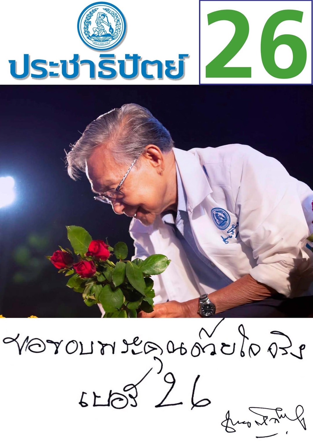 ด้วยความจริงใจ จากผม นายชวน หลีกภัย พรรคประชาธิปัตย์ เบอร์ 26 ขอบพระคุณครับ. – สำนักข่าวไทย