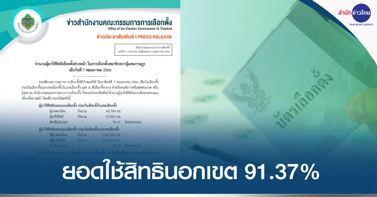 สำนักงาน กกต. 8 พ.ค. – กกต.แจงยอดใช้สิทธิเลือกตั้งล่วงหน้านอกเขตจังหวัด 91.37% ย้ำมาตรการส่งบัตรเลือกตั้งล่วงหน้าไปยังเขตของผู้ออกเสียงถูกต้องแน่