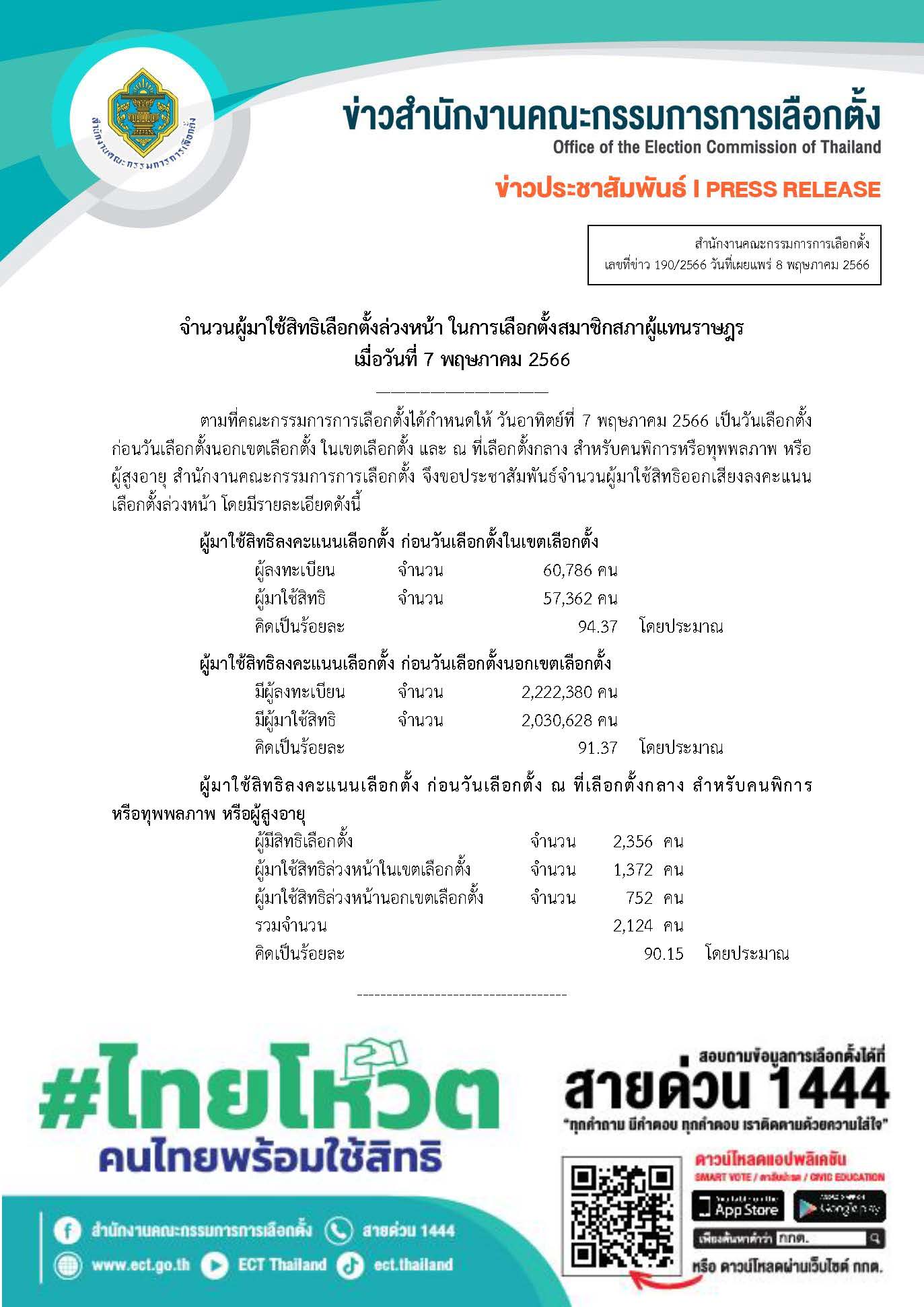 วันนี้ (8 พ.ค.66) สำนักงาน กกต.ได้แจ้งจำนวนผู้มาใช้สิทธิเลือกตั้งล่วงหน้า ในการเลือกตั้ง ส.ส. เมื่อวันที่ 7 พ.ค.66 โดยมีผู้ลงทะเบียนขอใช้สิทธิเลือกตั้งล่วงหน้าในเขตเลือกตั้ง จำนวน 60,786 คน มาใช้สิทธิจำนวน 57,362 คน คิดเป็นร้อยละ 94.37 โดยประมาณ ส่วนผู้ลงทะเบียนขอใช้สิทธิเลือกตั้งล่วงหน้านอกเขตเลือกตั้ง มีจำนวน 2,222,380 คน มาใช้สิทธิจำนวน 2,030,628 คน คิดเป็นร้อยละ 91.37 โดยประมาณ