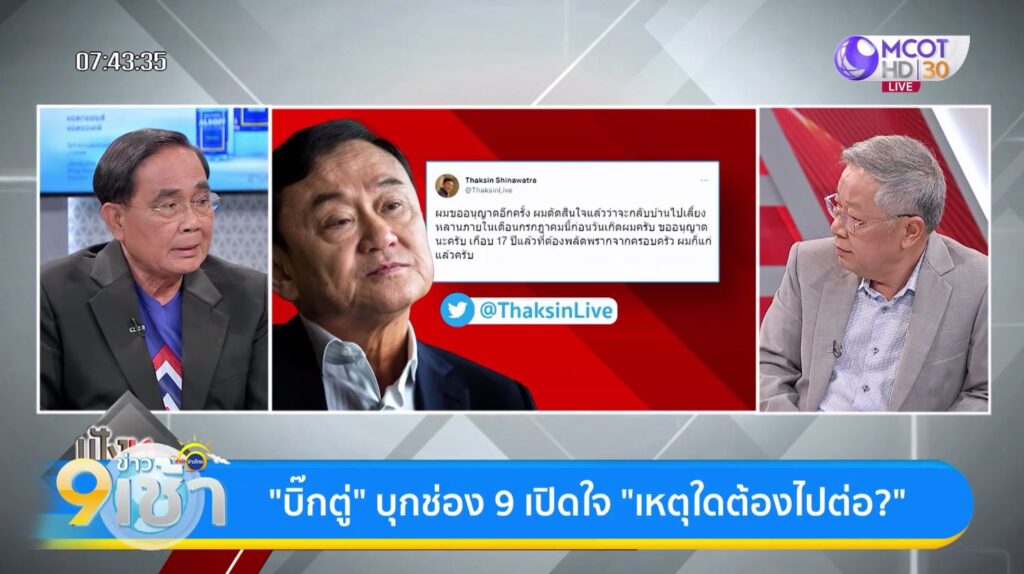 ส่วนกรณีที่ นายทักษิณ ชินวัตร ออกมาโพสต์ข้อความว่า จะเดินทางกลับบ้านมาเลี้ยงหลานภายในเดือนกรกฎาคมนี้ พลเอกประยุทธ์ ตอบกลับว่า เป็นเรื่องของเขา เพราะช่วงเวลานั้น จะเป็นนายกฯ ที่รักษาการอยู่แล้ว ส่วนตัวไม่ได้เป็นศัตรูกับเขา ส่วนปัญหาของเขา ต้องแก้ปัญหาด้วยตัวเอง ถ้าตามหลักแล้ว นายทักษิณ สามารถเดินทางกลับมาได้ตั้งนานแล้ว แต่ต้องยอมรับกฎ-กติกา ซึ่งรวมถึงคุณยิ่งลักษณ์ ชินวัตร อดีตนายกรัฐมนตรีด้วย เพราะทุกคนมีสิทธิกลับบ้านหมด ผมไม่ได้มีหน้าที่ไปยุ่งเกี่ยวกับกระทรวงยุติธรรม แล้วยืนยันว่าจะให้ความเป็นธรรม