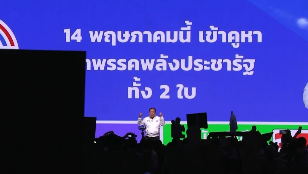 8 ปีในการเป็นรัฐบาลของพรรคพลังประชารัฐ ตนสามารถพูดคุยทุกคน รับฟังความเห็นต่างทุกฝ่าย ไม่มีอคติใดๆ และตลอดชีวิตตนมีหน้าที่ปกป้องประเทศจากศัตรูในรูปแบบต่างๆ โดยเฉพาะความมั่นคงต่อสถาบันหลักของชาติ วันนี้ตนได้เห็นแล้วว่าประเทศของเรายังมีปัญหาอีกมาก โดยเฉพาะปากท้องและความยากจน ไปจนถึงต้องก้าวข้ามความขัดแย้ง ตนและพรรคพลังประชารัฐมุ่งมั่นจะเอาชนะปัญหาของประชาชนให้ได้ พร้อมขอเสียงประชาชนที่ฟังปราศรัยว่ารับรองไหมว่าเราจะไปด้วยกัน ไปด้วยกันนะ