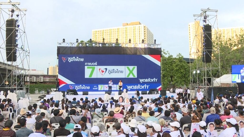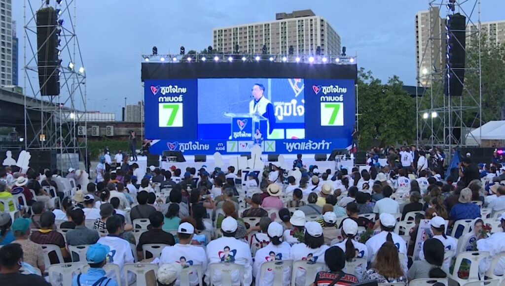 กรุงเทพฯ 12 พ.ค. – พรรคภูมิใจไทยเปิดเวทีปราศรัยใหญ่ครั้งสุดท้ายที่ลาน SHOW DC พระราม 9 บรรยากาศคึกคัก ท่ามกลางการตรึงกำลังรักษาความเรียบร้อย หลังนายชูวิทย์ กมลวิศิษฎ์ ประกาศจะมาร่วมสังเกตการณ์ ขณะ “อนุทิน” หัวหน้าพรรค มั่นใจจะได้จำนวน ส.ส. มากขึ้นกว่าเดิม