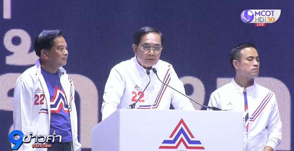 พล.อ.ประยุทธ์ จันทร์โอชา แคนดิเดตนายกรัฐมนตรีของพรรครวมไทยสร้างชาติ ปราศรัยปลุกคนไทยให้บอกปากต่อปาก ช่วยเลือกรวมไทยสร้างชาติ ที่เคยบอกว่าความสงบจบที่ลุงตู่เมื่อปี 2562 แต่ปี 2566 ก็ขอจบที่ลุงตู่ ย้ำประเทศไทยต้องไปต่อ ด้วยความรัก ความสามัคคี เอาชนะทุกอย่าง ตนได้ตรวจร่างกายแล้ว ยืนยันแข็งแรง แต่หัวใจโต