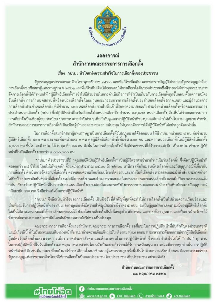 กกต. 13 พ.ค.- กกต.ออกแถลงการณ์ ชื่นชม “กปน.” เสียสละ ทุ่มเท อดทน หวังทำหน้าที่จัดการเลือกตั้งพรุ่งนี้ให้เป็นไปอย่าง ถูกต้อง เรียบร้อย รักษาเจตนารมณ์ผู้มีสิทธิเลือกตั้งให้เป็นไปตามเจตนารมณ์ที่ได้ออกเสียงลงคะแนนไว้
