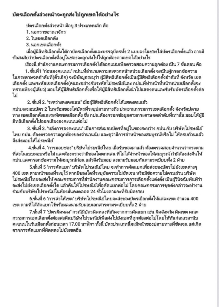 - ขั้นที่เจ็ด “บัตรผิดหลง” กรณีมีบัตรผิดหลงที่เกิดจากการคัดแยก เช่น ผิดจังหวัด ผิดเขต คณะกรรมการเขตเลือกตั้งต้องส่งคืนบริษัทไปรษณีย์ไทย เพื่อส่งไปยังเขตที่ถูกต้องต่อไปโดยให้ทันก่อนเวลานับคะแนนในวันเลือกตั้งก่อนเวลา 17.00 นาฬิกา ทั้งนี้ บัตรประเภทนี้จะมีหน้าซองปลายทางที่ชัดเจน แต่เกิดจากการคัดแยกที่ผิดหลงไปยังเขตอื่น .-สำนักข่าวไทย