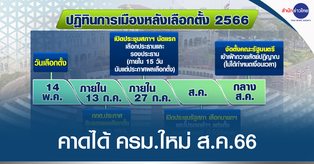 หลังจากนั้นจะต้องมีการเปิดประชุมสภาผู้แทนราษฎร นัดแรก เพื่อเลือกประธานและรองประธาน ภายใน 15 วัน นับตั้งแต่มีการประกาศผลการเลือกตั้งอย่างเป็นทางการ ซึ่งจะอยู่ในวันที่ 27 กรกฎาคม 2566 ทั้งนี้ ต้องมีการเปิดประชุมรัฐสภา เพื่อเลือกนายกรัฐมนตรี พร้อมทั้งโปรดเกล้าโปรดกระหม่อมแต่งตั้งนายกรัฐมนตรี ซึ่งในขั้นตอนนี้ไม่ได้มีการกำหนดระยะเวลา แต่คาดว่าจะอยู่ในช่วงเดือนสิงหาคม 2566 และจะมีการจัดตั้งคณะรัฐมนตรี และต้องเข้าเฝ้าฯ ถวายสัตย์ปฏิญาณ ซึ่งขั้นตอนนี้ก็ไม่ได้กำหนดระยะเวลาเช่นกัน แต่คาดว่าน่าจะอยู่ในช่วงกลางเดือนสิงหาคม 2566. – สำนักข่าวไทย