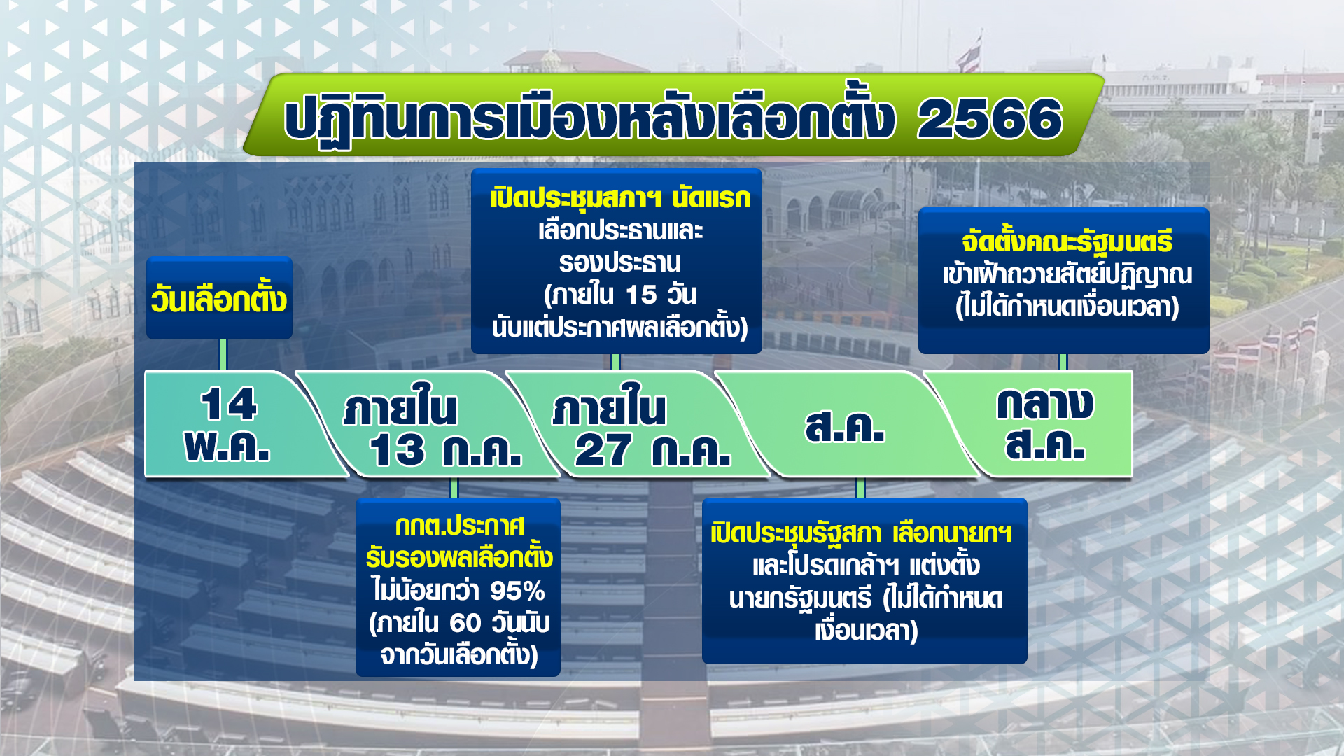 เปิดปฏิทินการเมือง หลังจากการเลือกตั้งเสร็จสิ้นลงในวันที่ 14 พฤษภาคม 2566 โดยขั้นตอนหลังจากนี้ กกต.จะต้องประกาศรับรองผลการเลือกตั้งอย่างเป็นทางการไม่น้อยกว่า 95% ภายใน 60 วัน นับจากวันเลือกตั้ง ซึ่งจะอยู่ภายในวันที่ 13 กรกฎาคม 2566