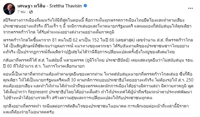 วันที่ 15 พ.ค.66 นายเศรษฐา ทวีสิน แคนดิเดตนายกรัฐมนตรี พรรคเพื่อไทย โพสต์ข้อความผ่านเฟซบุ๊กส่วนตัว ระบุว่า “สปิริตทางการเมืองที่ผมหวังให้มีที่สุดในตอนนี้ คือการเห็นทุกพรรคการเมืองไทยยึดโยงและทำตามเสียงประชาชนอย่างแท้จริง ที่ในเร็วๆ นี้ จะมีการเสนอและโหวตนายกรัฐมนตรี และผมเองก็สนับสนุนให้คุณพิธา จากพรรคก้าวไกล ได้รับตำแหน่งอย่างสง่างามอย่างเต็มภาคภูมิ