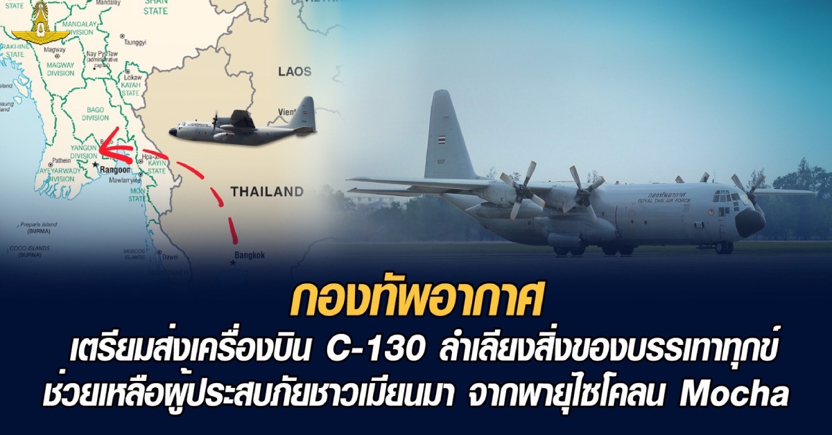 กรุงเทพฯ 20 พ.ค. – กองทัพอากาศเตรียมเครื่องบิน C-130 จำนวน 2 เครื่อง นำส่งสิ่งของบรรเทาทุกข์ช่วยเหลือด้านมนุษยธรรมแก่สาธารณรัฐแห่งสหภาพเมียนมา จากกรณีพายุไซโคลน Mocha พัดถล่ม