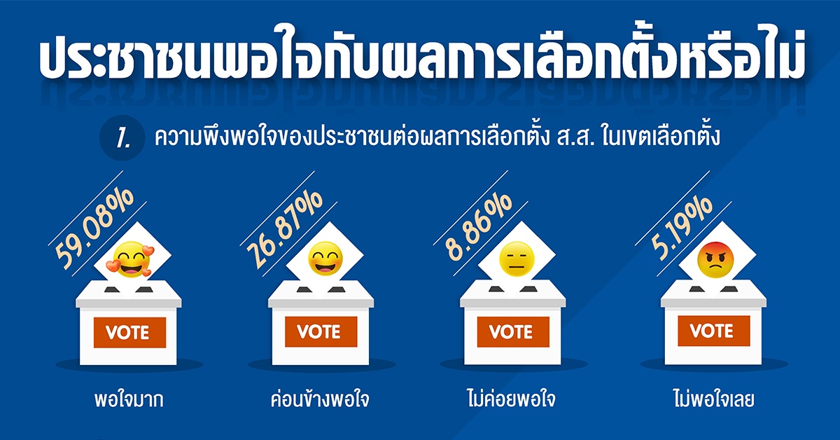 ด้านความพึงพอใจของประชาชนต่อผลการเลือกตั้ง ส.ส. ในภาพรวมทั้งประเทศ พบว่า ตัวอย่าง ร้อยละ 59.39 ระบุว่า พอใจมาก รองลงมา ร้อยละ 30.07 ระบุว่า ค่อนข้างพอใจ ร้อยละ 6.95 ระบุว่า ไม่ค่อยพอใจ และร้อยละ 3.59 ระบุว่า ไม่พอใจเลย