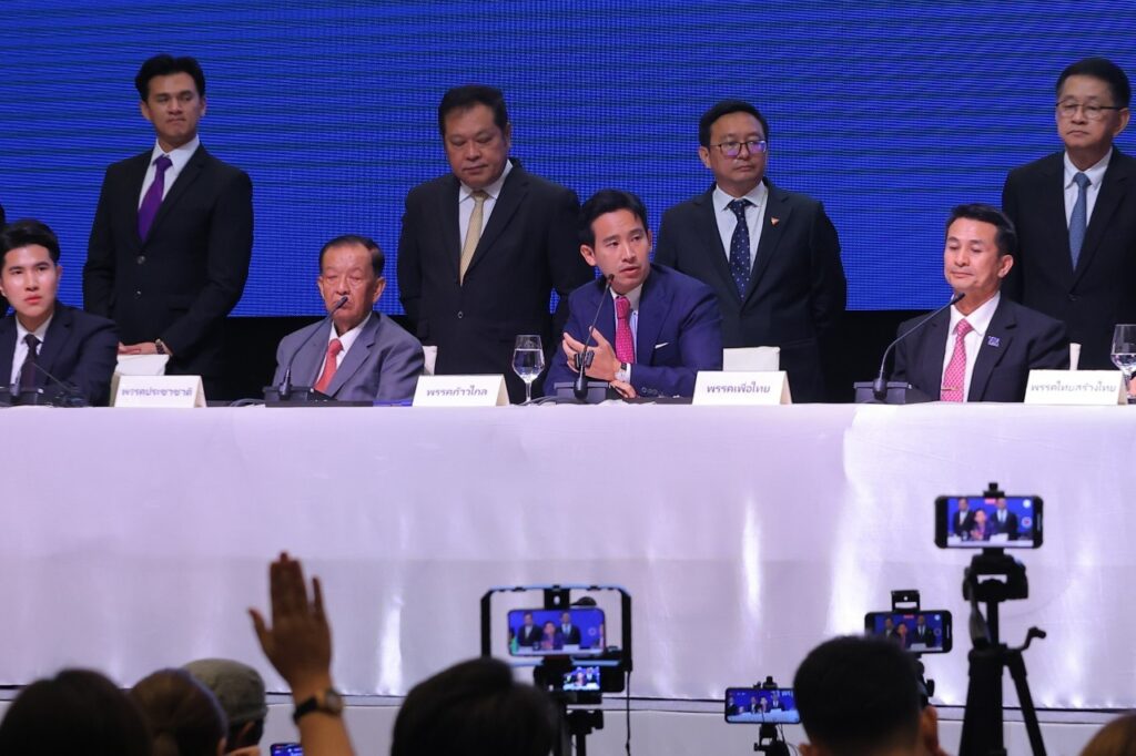 ภายหลังจากการลงนามในบันทึกความเข้าใจ (MOU) ในจัดตั้งรัฐบาล นายพิธา ลิ้มเจริญรัตน์ หัวหน้าพรรคก้าวไกล เปิดโอกาสให้สื่อมวลชนได้สอบถาม โดยคำถามแรกคือเรื่องการแก้ไขกฎหมายอาญามาตรา 112 ที่ไม่อยู่ใน MOU แสดงว่ารัฐบาลพรรคก้าวไกล แม้ตั้งรัฐบาลได้ก็คงไม่สามารถแก้ไขได้เนื่องจากเสียงไม่พอใช่หรือไม่ นายพิธา กล่าวว่า พรรคก้าวไกลยืนยันยังทำอยู่ และเมื่อเดือน ก.พ.ปี64 ได้ยื่นต่อสภา แต่ยังไม่มีการบรรจุในวาระ ซึ่งเชื่อว่าครั้งนี้จะสำเร็จลุล่วงไปได้ด้วยดีโดยการดำเนินการของพรรคก้าวไกล และตอนนี้บรรยากาศก็เปลี่ยนแปลงไปมาก ยกตัวอย่างได้อย่างได้จากสื่อมวลชนที่กล้าพูดเรื่องนี้อย่างมีนัยสำคัญ และมีวุฒิภาวะ