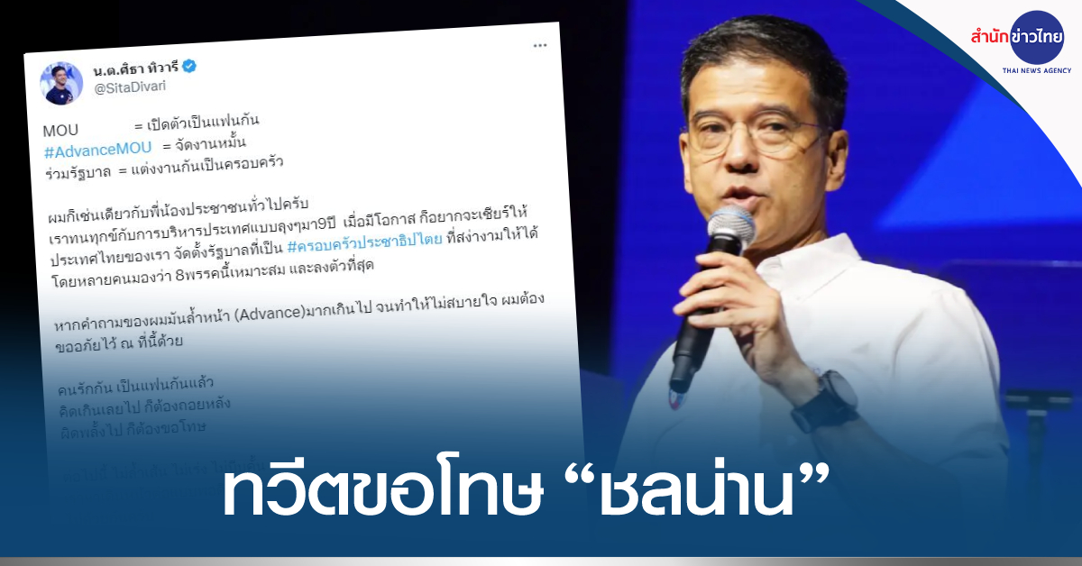 ผู้สื่อข่าวรายงานว่า ภายหลังจากที่ น.ต.ศิธา ทิวารี แคนดิเดตนายกรัฐมนตรีของพรรคไทยสร้างไทย ตั้งคำถามในเวทีแถลง MOU จัดตั้งรัฐบาลของพรรคกาวไกล และยังโพสต์เฟซบุ๊กพาดพิง นพ.ชลน่าน ศรีแก้ว หัวหน้าพรรคเพื่อไทย จนสร้างความไม่พอใจให้แก่ นพ.ชลน่าน โดยเรียกร้องให้พรรคก้าวไกลเคลียร์เรื่องดังกล่าว ให้ น.ต.ศิธา ขอโทษ ล่าสุด น.ต.ศิธา ได้ทวีตข้อความเมื่อเวลา 10.43 น. ขอโทษและขออภัยต่อกรณีถามคำถามในวันแถลง MOU ตั้งรัฐบาล
