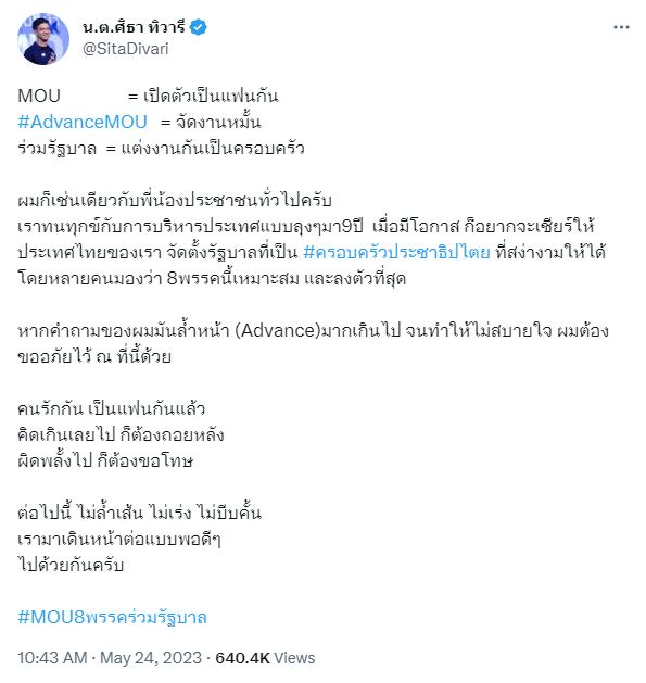 โดยข้อความทวีต ระบุว่า “MOU = เปิดตัวเป็นแฟนกัน #AdvanceMOU = จัดงานหมั้น ร่วมรัฐบาล = แต่งงานกันเป็นครอบครัว ผมก็เช่นเดียวกับพี่น้องประชาชนทั่วไปครับ เราทนทุกข์กับการบริหารประเทศแบบลุงๆ มา 9 ปี เมื่อมีโอกาส ก็อยากจะเชียร์ให้ประเทศไทยของเราจัดตั้งรัฐบาลที่เป็น #ครอบครัวประชาธิปไตย ที่สง่างามให้ได้ โดยหลายคนมองว่า 8 พรรคนี้เหมาะสม และลงตัวที่สุด หากคำถามของผมมันล้ำหน้า (Advance) มากเกินไป จนทำให้ไม่สบายใจ ผมต้องขออภัยไว้ ณ ที่นี้ด้วย”