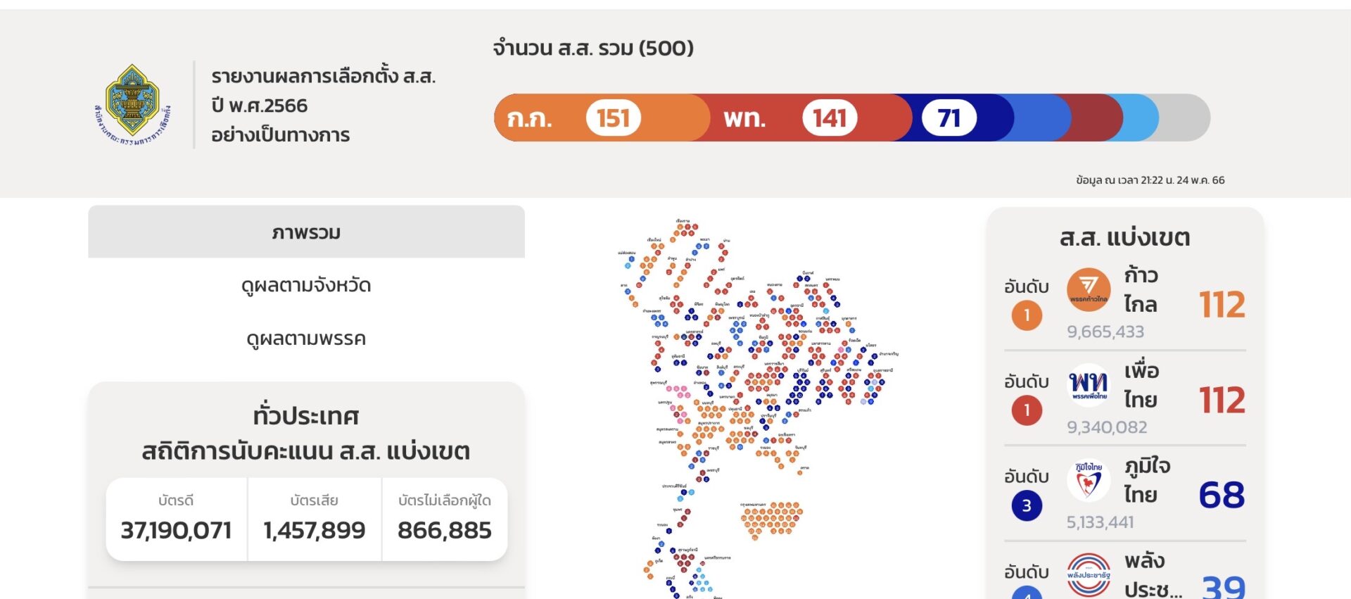 กกต. 25 พ.ค.-กกต. ประกาศผลการเลือกตั้ง ส.ส. 66 อย่างเป็นทางการ “ก้าวไกล” กวาด 151 คน แต่ได้ ส.ส.เขตเท่ากับเพื่อไทย 112 คน อีก 11 พรรคได้ ส.ส.บัญชีรายชื่อ 1 คน มีผู้มาใช้สิทธิ 39 ล้านคน บัตรเสียมากกว่า 3% เกินเป้าหมาย