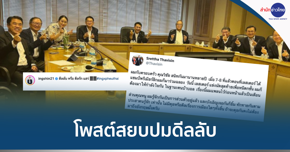พรรคเพื่อไทย 29 พ.ค.- “อุ๊งอิ๊ง” โพสต์ภาพประชุมที่พรรคเพื่อไทย พร้อมระบุ “ดีลลับ หรือ ดีลรัก แฮร่” ด้าน “เศรษฐา” ยันไม่มีคุยหรือดีลเรื่องการเมือง หลังปรากฏภาพร่วมเฟรมกับ “อนุทิน” ในสนามฟุตบอลที่อังกฤษ