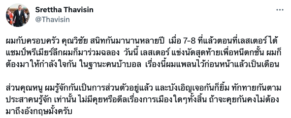 ขณะที่นายเศรษฐา ทวีสิน แคนดิเดตนายกรัฐมนตรี พรรคเพื่อไทย โพสต์ทวิตเตอร์ส่วนตัวชี้แจง หลังมีภาพปรากฏกับนายอนุทิน ชาญวีรกูล หัวหน้าพรรคภูมิใจไทย ไปร่วมชมการแข่งฟุตบอลพรีเมียร์ลีก นัดปิดสนามที่อังกฤษ ว่า “ผมกับครอบครัว คุณวิชัย สนิทกันมานานหลายปี เมื่อ 7-8 ที่แล้วตอนที่เลสเตอร์ ได้แชมป์พรีเมียร์ลีกผมก็มาร่วมฉลอง วันนี้ เลสเตอร์ แข่งนัดสุดท้ายเพื่อหนีตกชั้น ผมก็ต้องมาให้กำลังใจกัน ในฐานะคนบ้าบอล เรื่องนี้ผมแพลนไว้ก่อนหน้าแล้วเป็นเดือน ส่วนคุณหนู ผมรู้จักกันเป็นการส่วนตัวอยู่แล้ว และบังเอิญเจอกันก็ยิ้ม ทักทายกันตามประสาคนรู้จัก เท่านั้น ไม่มีคุยหรือดีลเรื่องการเมืองใดๆทั้งสิ้น ถ้าจะคุยกันคงไม่ต้องมาถึงอังกฤษมั้งครับ” .- สำนักข่าวไทย