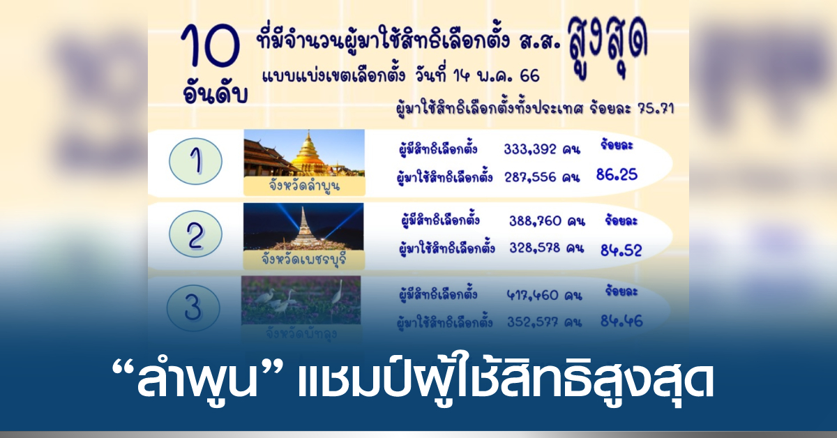 วันนี้ (30 พ.ค.66) สำนักงานคณะกรรมการการเลือกตั้ง เผยแพร่สถิติข้อมูลการใช้สิทธิเลือกตั้งสมาชิกสภาผู้แทนราษฎร เป็นการเลือกตั้งทั่วไป เมื่อวันอาทิตย์ที่ 14 พฤษภาคม 10 อันดับแรก ประกอบด้วย อันดับหนึ่ง จ.ลำพูน ผู้มีสิทธิเลือกตั้ง 333,392 คน ผู้มาใช้สิทธิเลือกตั้ง 287,556 คน ร้อยละ 86.25 อันดับสอง จ.เพชรบุรี ผู้มีสิทธิเลือกตั้ง 388,760 คน ผู้มาใช้สิทธิเลือกตั้ง 328,578 คน ร้อยละ 84.52 อันดับสาม จ.พัทลุง ผู้มีสิทธิเลือกตั้ง 417,460 คน ผู้มาใช้สิทธิเลือกตั้ง 352,577 คน ร้อยละ 84.46 อันดับสี่ จ.นครปฐม ผู้มีสิทธิเลือกตั้ง 739,715 คน ผู้มาใช้สิทธิเลือกตั้ง 617,774 คน ร้อยละ 83.52 อันดับห้า จ.ฉะเชิงเทรา ผู้มีสิทธิเลือกตั้ง 575,796 คน ผู้มาใช้สิทธิเลือกตั้ง 477,004 คน ร้อยละ 82.84 และ จ.ราชบุรี ผู้มีสิทธิเลือกตั้ง 682,471 คน ผู้มาใช้สิทธิเลือกตั้ง 565,364 คน ร้อยละ 82.84