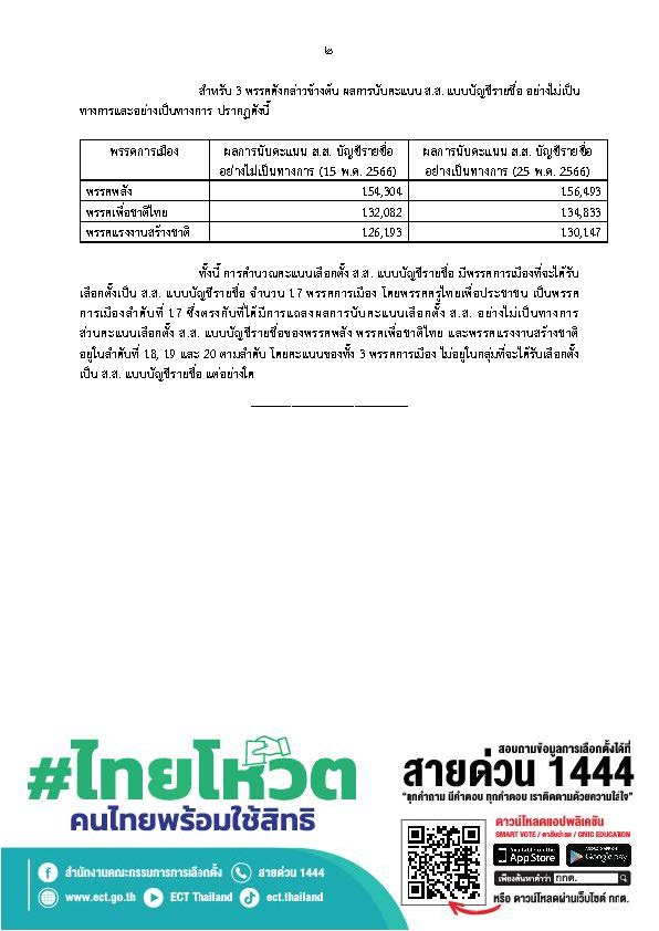ส่วนผลการนับคะแนน ส.ส.บัญชีรายชื่อ อย่างเป็นทางการ เมื่อวันที่ 25 พ.ค.66 พรรคพลัง ได้คะแนน 156,493 คะแนน พรรคเพื่อชาติไทย ได้คะแนน 134,833 คะแนน พรรคแรงงานสร้างชาติ ได้คะแนน 130,147 คะแนน