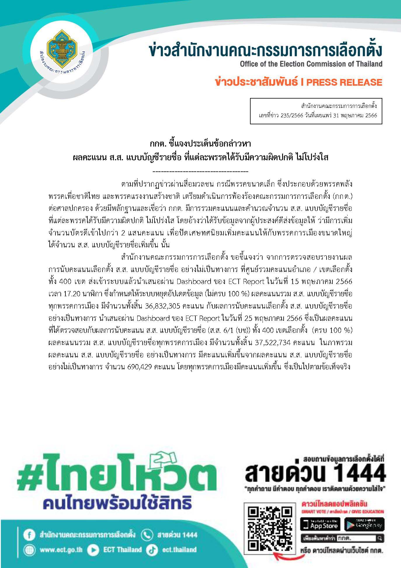 จากการตรวจสอบรายงานผลการนับคะแนนเลือกตั้ง ส.ส. แบบบัญชีรายชื่อ อย่างไม่เป็นทางการ ที่ศูนย์รวมคะแนนอำเภอ เขตเลือกตั้ง ทั้ง 400 เขต ส่งเข้าระบบแล้วนำเสนอผ่าน Dashboard ของ ECT Report ในวันที่ 15 พ.ค.66 เวลา 17.20 น. ซึ่งกำหนดให้ระบบหยุดอัปเดตข้อมูล (ไม่ครบ 100%) ผลคะแนนรวม ส.ส. แบบบัญชีรายชื่อทุกพรรคการเมือง มีจำนวนทั้งสิ้น 36,832,305 คะแนน กับผลการนับคะแนนเลือกตั้ง ส.ส. แบบบัญชีรายชื่อ อย่างเป็นทางการ นำเสนอผ่าน Dashboard ของ ECT Report ในวันที่ 25 พ.ค.66 ซึ่งเป็นผลคะแนนที่ได้ตรวจสอบกับผลการนับคะแนน ส.ส. แบบบัญชีรายชื่อ (ส.ส. 6/1 (บช)) ทั้ง 400 เขตเลือกตั้ง ครบ 100% ผลคะแนนรวม ส.ส. แบบบัญชีรายชื่อทุกพรรคการเมือง มีจำนวนทั้งสิ้น 37,522,734 คะแนน