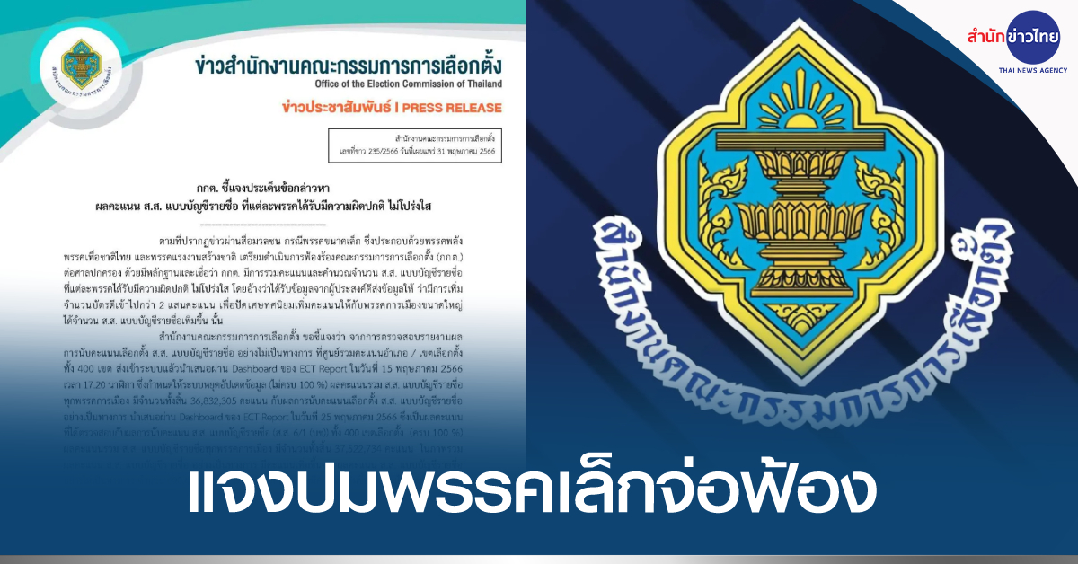 สำนักงาน กกต. 31 พ.ค. – กกต.แจงปมพรรคเล็กเตรียมฟ้อง ยืนยันคิดคะแนน ส.ส.บัญชีรายชื่อ ถูกต้อง ชี้คะแนน 3 พรรคไม่อยู่ในกลุ่มที่จะได้ ส.ส.