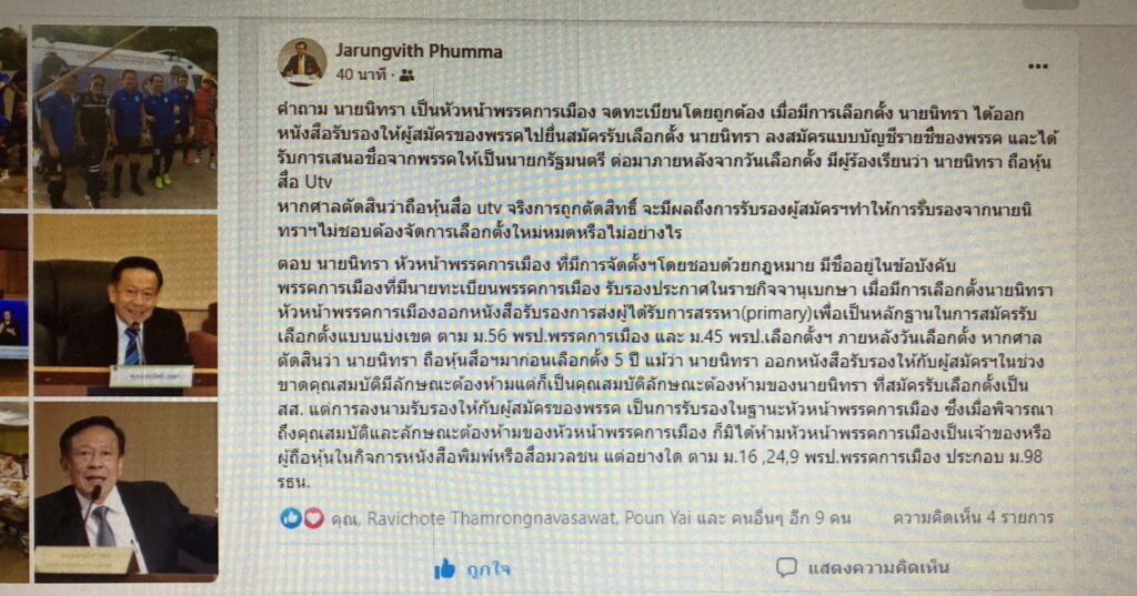 พ.ต.อ.จรุงวิทย์ ภุมมา อดีตเลขาธิการ กกต. ในฐานะสมาชิกวุฒิสภา โพสต์ข้อความลงในเฟซบุ๊กส่วนตัว แสดงความเห็นกรณีนายพิธา ลิ้มเจริญรัตน์ แคนดิเดตนายกรัฐมนตรี จากพรรคก้าวไกล ถูกตรวจสอบเรื่องการถือหุ้นสื่อ เข้าข่ายอาจขาดคุณสมบัติ และถูกตัดสิทธิในการลงสมัครรับเลือกตั้ง ส.ส. โดย พ.ต.อ.จรุงวิทย์ ได้เขียนชื่อผู้ถูกร้อง เป็นชื่อสมมติว่า “นายนิทรา” และแสดงความเห็นว่า ถ้ามีหัวหน้าพรรคการเมือง ที่จดทะเบียนโดยถูกต้อง ได้ออกหนังสือรับรองให้ผู้สมัครของพรรค ไปยื่นสมัครรับเลือกตั้ง ส.ส. และหัวหน้าพรรคคนนั้น ยังได้รับการเสนอชื่อให้เป็นนายกรัฐมนตรี แต่ในภายหลังจากวันเลือกตั้ง กลับถูกร้องว่าถือครองหุ้นสื่อ และหากศาลฯ ตัดสินว่า ถือหุ้นสื่อจริง ก็ไม่เป็นเหตุให้ต้องเลือกตั้งใหม่ทั้งประเทศ