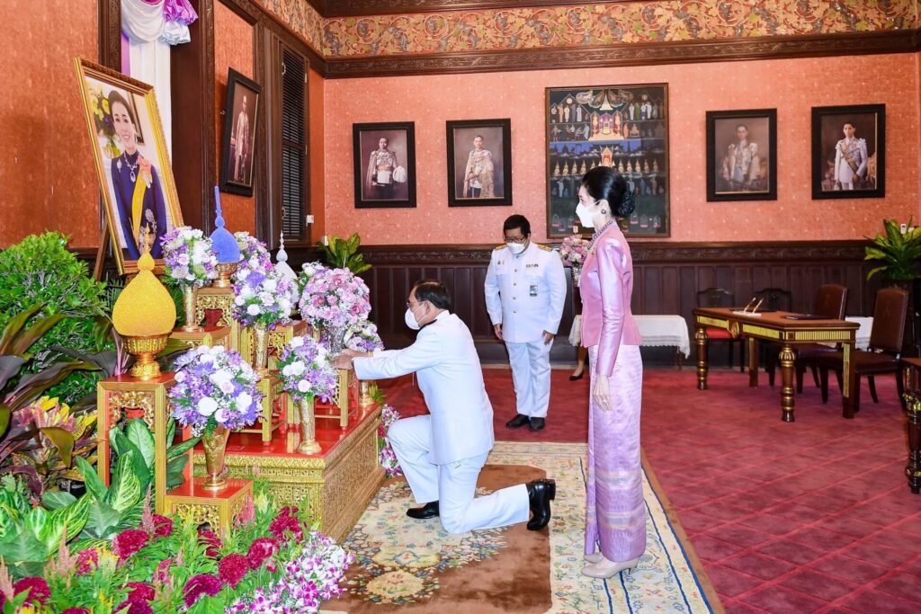 นายกรัฐมนตรีทูลเกล้าฯ ถวายแจกันดอกไม้เบื้องหน้าพระฉายาลักษณ์สมเด็จพระนางเจ้าฯ พระบรมราชินี ดังนี้