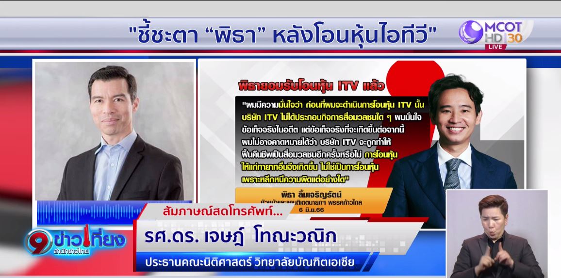 กทม. 7 มิ.ย. – หลัง “พิธา ลิ้มเจริญรัตน์” โอนหุ้นไอทีวีให้ทายาทไปแล้ว ตั้งแต่เดือน พ.ค.ที่ผ่านมา เรื่องนี้จะส่งผลต่อเส้นทางการเมืองของ “พิธา” อย่างไร ไปพูดคุยกับ รศ.ดร. เจษฎ์ โทณะวณิก ประธานคณะนิติศาสตร์ วิทยาลัยบัณฑิตเอเซีย . – สำนักข่าวไทย