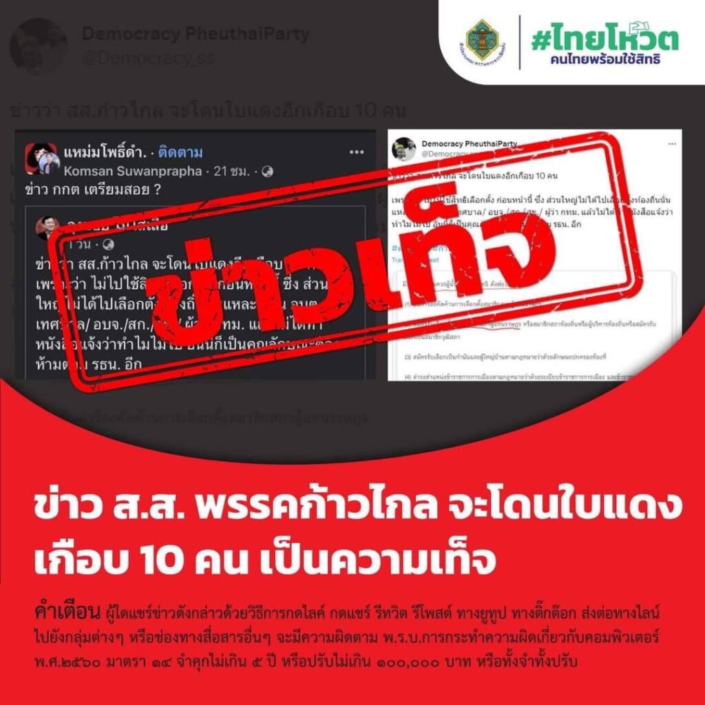 ผู้สื่อข่าวรายงานว่า สำนักงานกกต. ออกเอกสารชี้แจง กรณีมีผู้ใช้ชื่อบัญชีว่า “Democracy PheuthaiParty” และเฟซบุ๊กชื่อ “แหม่มโพธิ์ดำ.” โพสต์ในทวิตเตอร์ ว่า “ส.ส.ก้าวไกล จะโดนใบแดงอีกเกือบ 10 คน เพราะว่า ไม่ไปใช้สิทธิเลือกตั้ง ก่อนหน้านี้ ซึ่งส่วนใหญ่ไม่ได้ไปเลือกตั้งท้องถิ่นนั่นแหละ เช่น อบต./เทศบาล/ อบจ./สก./สข./ ผู้ว่า กทม. แล้วไม่ได้ทำหนังสือแจ้งว่าทำไมไม่ไป อันนี้ก็เป็นคุณลักษณะต้องห้ามตาม รธน. อีก” ว่าข้อความดังกล่าวเป็นข้อความเท็จ โดย กกต. หรือเจ้าหน้าที่ที่ปฏิบัติงานในสำนักงาน กกต. หรือบุคคลที่เกี่ยวข้องทุกคน ไม่เคยให้ข้อมูล หรือเผยแพร่ข่าวสาร หรือแจ้งข่าว ไปยังสื่อมวลชนหรือช่องทางการสื่อสารใดๆ ว่า ส.ส. พรรคก้าวไกล จะถูกจำกัดสิทธิสมัครรับเลือกตั้งเป็น ส.ส. หรือถูกดำเนินคดีตามกฎหมายเลือกตั้งและพรรคการเมือง หรือจะเป็นผู้ได้รับใบแดง จำนวน 10 คน ตามที่สื่อต่างๆ ได้นำข้อความไปโพสต์แต่อย่างใดทั้งสิ้น