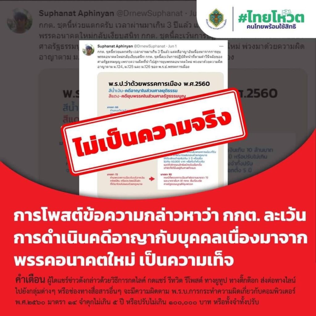 นอกจากนี้ยังชี้แจงกรณีผู้ใช้ชื่อบัญชีว่า “Suphanat Aphinyan” โพสต์ทวิตเตอร์ กล่าวหาว่า “กกต. ชุดนี้ห่วยแตกครับ เวลาผ่านมาเกิน 3 ปีแล้ว แต่คดีอาญาอันเนื่องมาจากการยุบพรรคอนาคตใหม่กลับเงียบสนิท กกต. ชุดนี้ละเว้นการปฏิบัติหน้าที่ตามคำวินิจฉัยของศาลรัฐธรรมนูญ เพราะความผิดที่นำไปสู่การยุบพรรคอนาคตใหม่ พ่วงมาด้วยความผิดอาญาตาม ม.124, ม.125 และ ม.126 ของ พ.ร.ป.พรรคการเมือง” โดยชี้แจงว่า ข้อความดังกล่าวเป็นความเท็จ เมื่อศาลรัฐธรรมนูญมีคำวินิจฉัยให้ยุบพรรคอนาคตใหม่ กกต. ได้มีมติให้ดำเนินคดีอาญากับผู้ดำรงตำแหน่งในพรรคอนาคตใหม่ จำนวน 16 คน โดยแจ้งความร้องทุกข์ต่อพนักงานสอบสวน สถานีตำรวจนครบาลมักกะสัน และ พนักงานสอบสวนได้รับคำร้องทุกข์ คดีอาญาที่ 403/2564 ดำเนินการให้เป็นไปตาม พ.ร.ป. ว่าด้วยพรรคการเมือง พ.ศ. 2560 เป็นที่เรียบร้อยแล้ว คาดว่า พนักงานสอบสวน สามารถดำเนินการสอบสวนให้เสร็จสิ้นได้ ภายในระยะเวลาอันใกล้นี้ ดังนั้น กกต. จึงไม่ได้ละเว้นการดำเนินคดีอาญากับผู้ดำรงตำแหน่งในพรรคอนาคตใหม่ จำนวน 16 คน และ กกต. ได้ดำเนินคดีอาญากับบุคคลทุกคนที่กระทำความผิดกฎหมายเกี่ยวกับการเลือกตั้งและพรรคการเมือง ไม่ว่าบุคคลนั้นจะเป็นสมาชิกหรือผู้ดำรงตำแหน่งในพรรคการเมืองใดๆ โดยไม่มีการละเว้นแต่อย่างใด ทั้งสิ้น