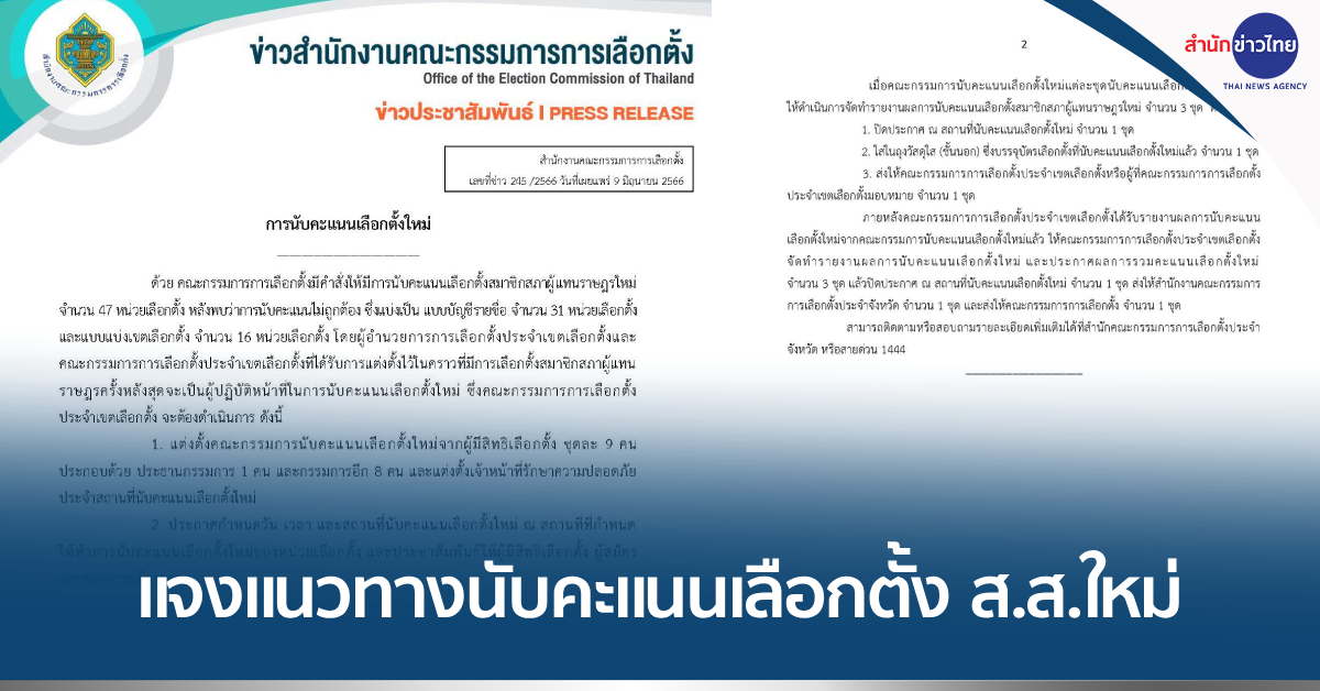 สำนักงานคณะกรรมการการเลือกตั้ง ชี้แจงแนวทางการนับคะแนนเลือกตั้ง ส.ส.ใหม่ จำนวน 47 หน่วยเลือกตั้ง หลังพบว่าการนับคะแนนไม่ถูกต้อง แบ่งเป็นแบบบัญชีรายชื่อ 31 หน่วยเลือกตั้ง และแบบแบ่งเขตเลือกตั้ง 16 หน่วยเลือกตั้ง โดยการนับคะแนนใหม่จะใช้ผู้อำนวยการการเลือกตั้งประจำเขตเลือกตั้ง และคณะกรรมการการเลือกตั้งประจำเขตเลือกตั้ง ที่ได้รับการแต่งตั้งในการเลือกตั้งเมื่อวันที่ 14 พฤษภาคม เป็นผู้นับคะแนนเลือกตั้งใหม่