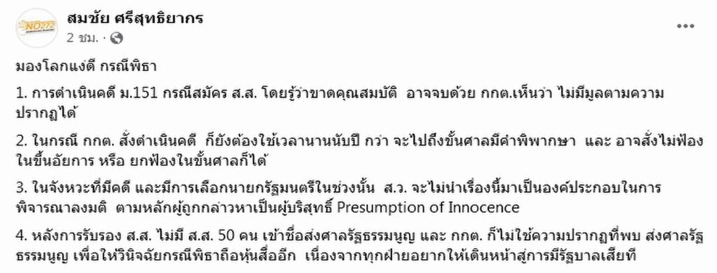 กทม. 10 มิ.ย.-นายสมชัย ศรีสุทธิยากร อดีต กกต. โพสต์ Facebook หัวข้อ “มองโลกแง่ดี กรณีพิธา” 4 ข้อ .-สำนักข่าวไทย