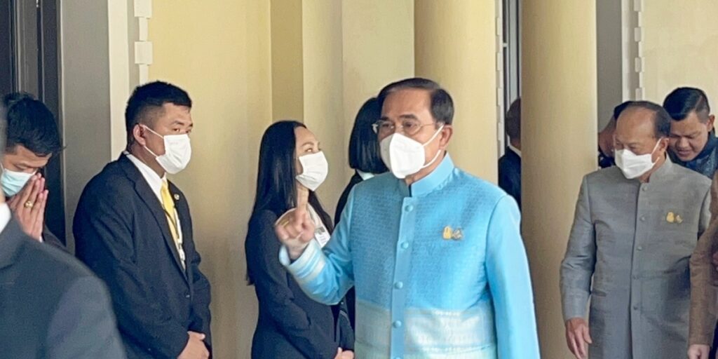 พลเอกประยุทธ์ จันทร์โอชา นายกรัฐมนตรีและรัฐมนตรีว่าการกระทรวงกลาโหม เป็นประธานการประชุมคณะรัฐมนตรีประจำสัปดาห์ โดยระหว่างเดินลงจากตึกไทยคู่ฟ้าไปยังตึกสันติไมตรี