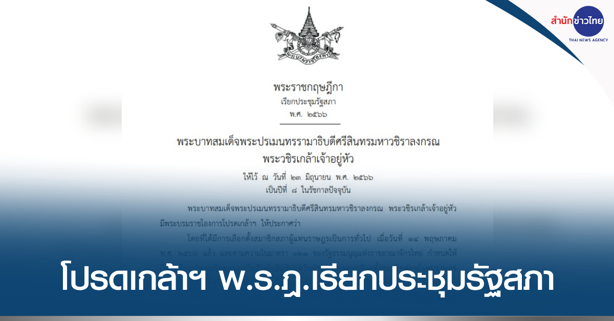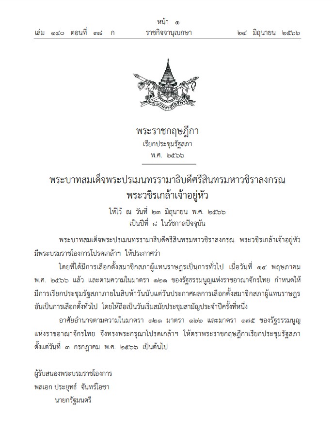 เมื่อวันที่ 24 มิถุนายน 2566 เว็บไซต์ราชกิจจานุเบกษา เผยแพร่พระราชกฤษฎีกาเรียกประชุมรัฐสภา พ.ศ. 2566 ระบุว่า พระบาทสมเด็จพระปรเมนทรรามาธิบดีศรีสินทรมหาวชิราลงกรณ พระวชิรเกล้าเจ้าอยู่หัว มีพระบรมราชโองการโปรดเกล้าฯ ให้ประกาศว่า
