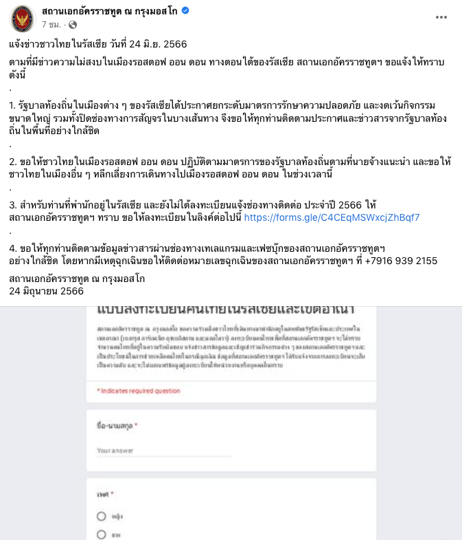สถานเอกอัครราชทูต ณ กรุงมอสโก ได้ชี้แจงสถานการณ์ ดังนี้