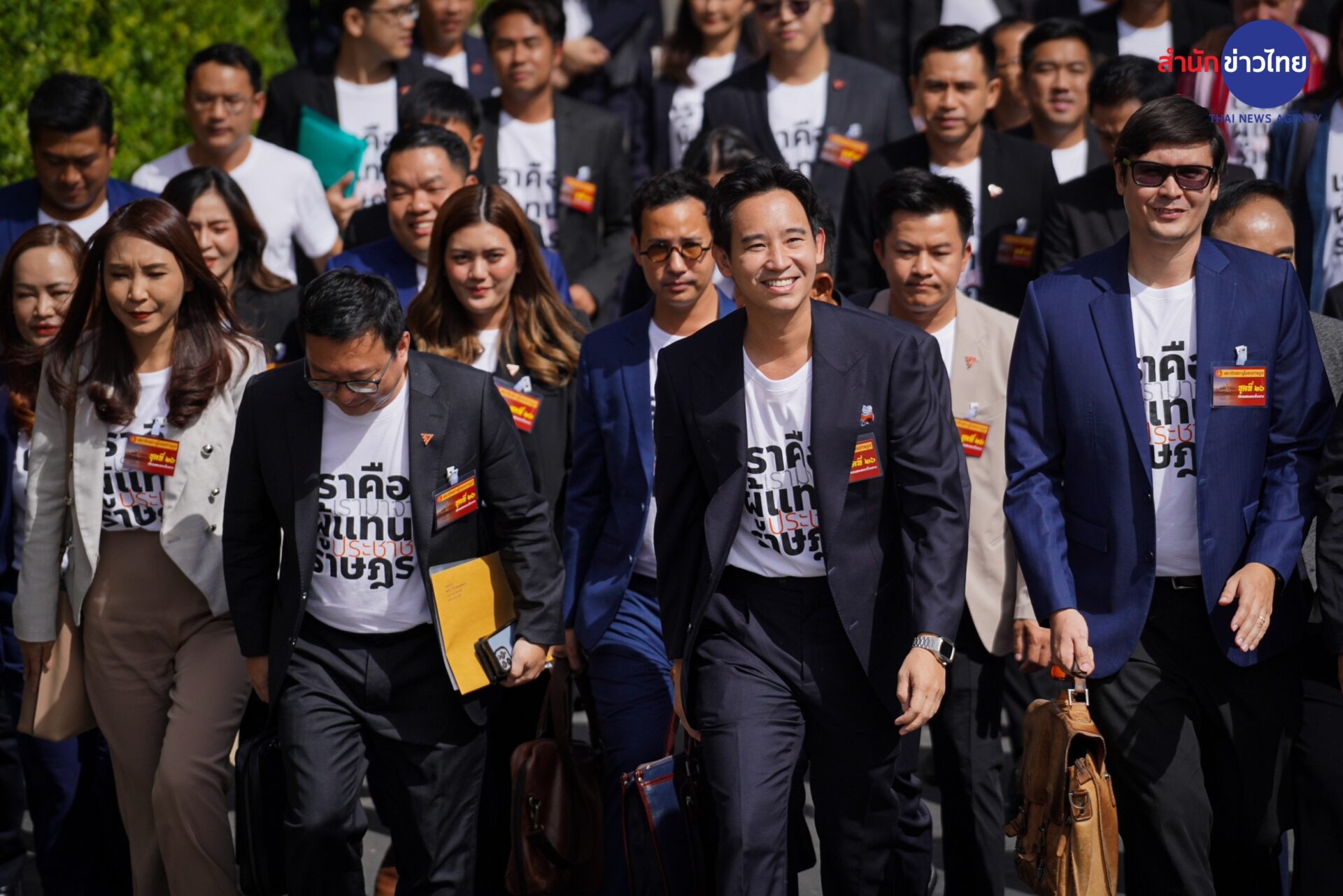 รัฐสภา 27 มิ.ย.-“พิธา” นำทัพ 150 ส.ส.ก้าวไกล รายงานตัวที่สภา สวมเสื้อ “เราคือผู้แทนราษฎร เรามาจากประชาชน’ ลั่นไม่ห่วงเสียง ส.ว. มั่นใจเสียงพอเป็นนายกฯ แน่นอน ปัดตอบแผนสำรองหากไม่ได้ ปธ.สภาฯ รอผลคุยเพื่อไทยพรุ่งนี้ ด้านเจ้าหน้าที่สภาแห่กรี๊ด